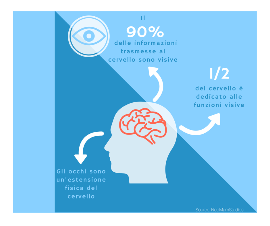È stato dimostrato che molti utenti più che leggere la newsletter, la scansionano visivamente. Ecco che quindi uno degli elementi più importanti e che può fare in modo che la newsletter venga poi letta per davvero, è il colore che decidiamo di usare per la grafica. Come si può vedere nell’infografica sottostante, infatti, le informazioni visive hanno un accesso diretto e molto più veloce al nostro cervello.