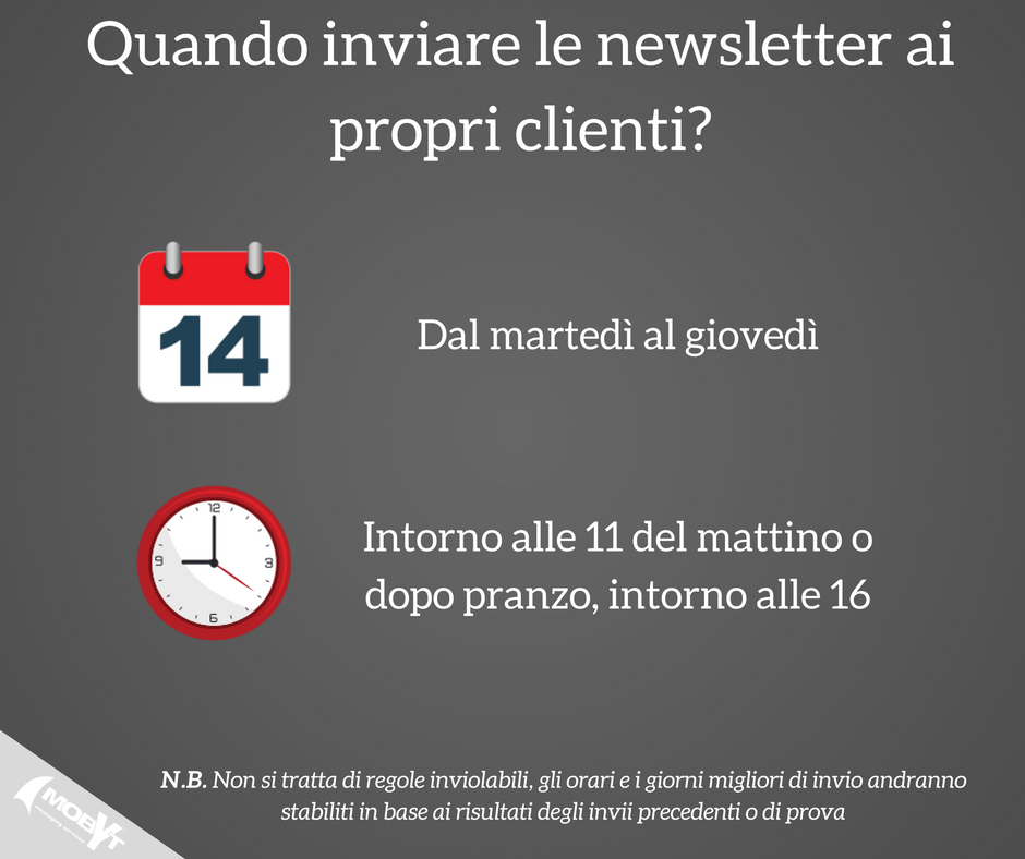 I giorni e gli orari più indicati per programmare l’invio delle newsletter infatti possono dipendere da moltissimi fattori, in primis la tipologia di prodotto o servizio offerto e la tipologia di pubblico al quale ci si rivolge.