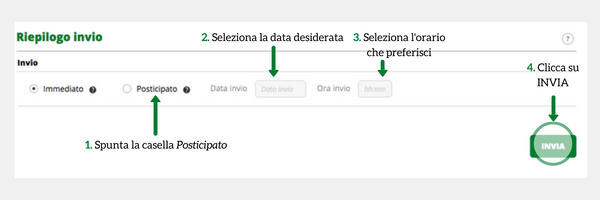 Come si fa a programmare quindi sulla piattaforma l’invio delle EMAIL? Come dicevamo sopra, è molto semplice! Una volta preparata la fase di composizione dell’EMAIL: